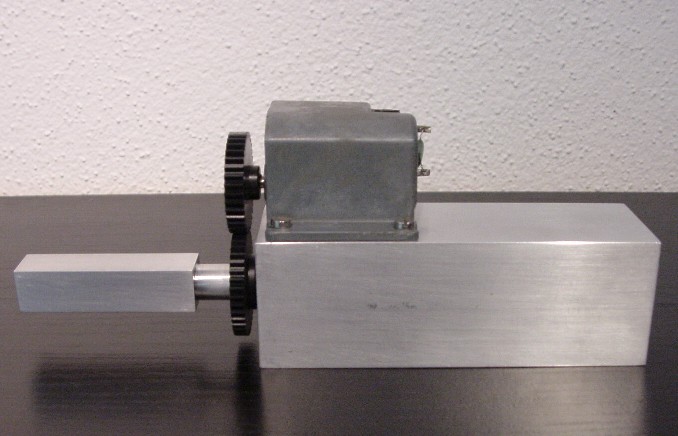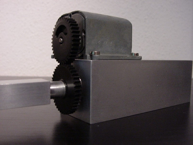 View from the left: The mounting block, the motor with reduction gear,and the square bolt for attachment of the beam