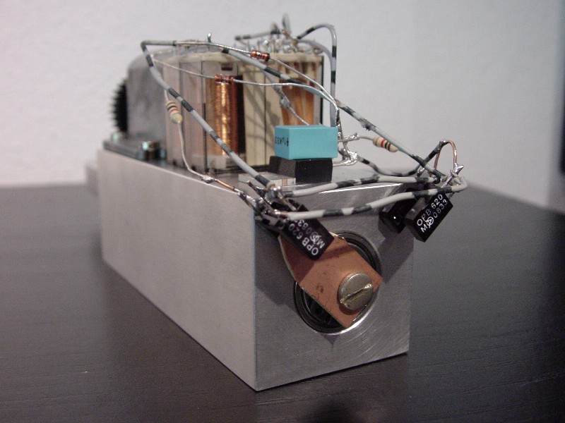 Rear view: You can see the axis and the rear bearing with the flag attached , the optical switches and the control electronics.