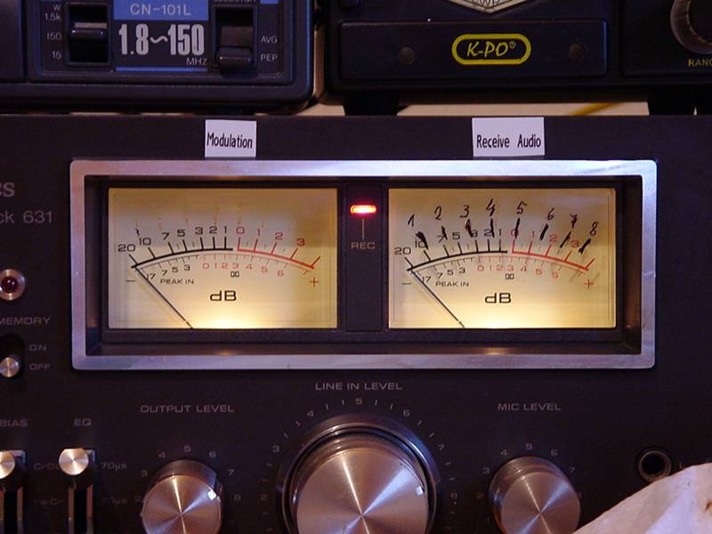 The two Stereo Channels are split up now. The right Level Meter shows the Receive Audio from IC-7000. It is also calibrated to directly indicate FM in KHz. The left Level Meter shows Modulation Signal from the Sound Card. The Modulation can be adjusted by using the Knob “OUTPUT LEVEL”. When using a Headset the Microphone-Gain can be adjusted by using the Knob “MIC LEVEL”